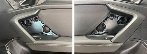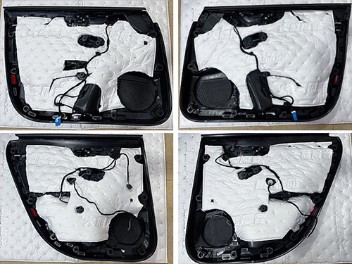 要想音質得到整體的提升,細節方面的處理也十分重要。四門隔音對于音響改裝來說,是必不可少的一步,專業的的隔音施工能使得門板形成一個良好的音響箱體,可以提升中低頻的音響效果。使用四門大能藍金剛及吸音棉對門板進行三層隔音降噪施工,增強鈑金剛性同時也為喇叭提供一個良好的發聲環境。