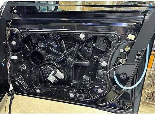 使用專業(yè)隔音材料對四門進行隔音處理,讓整個車廂成為一個密封的箱體,提升喇叭的效果,也能提升車門鈑金厚度